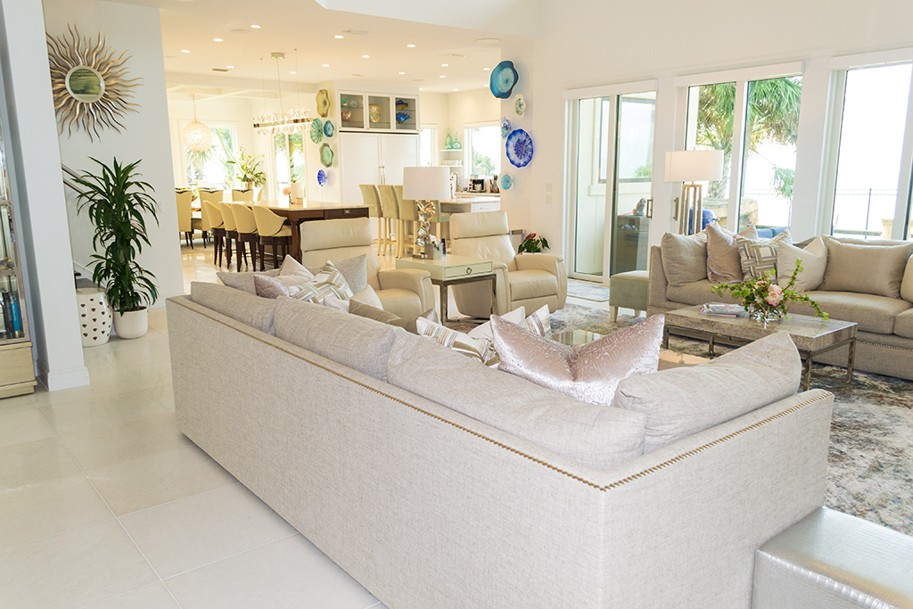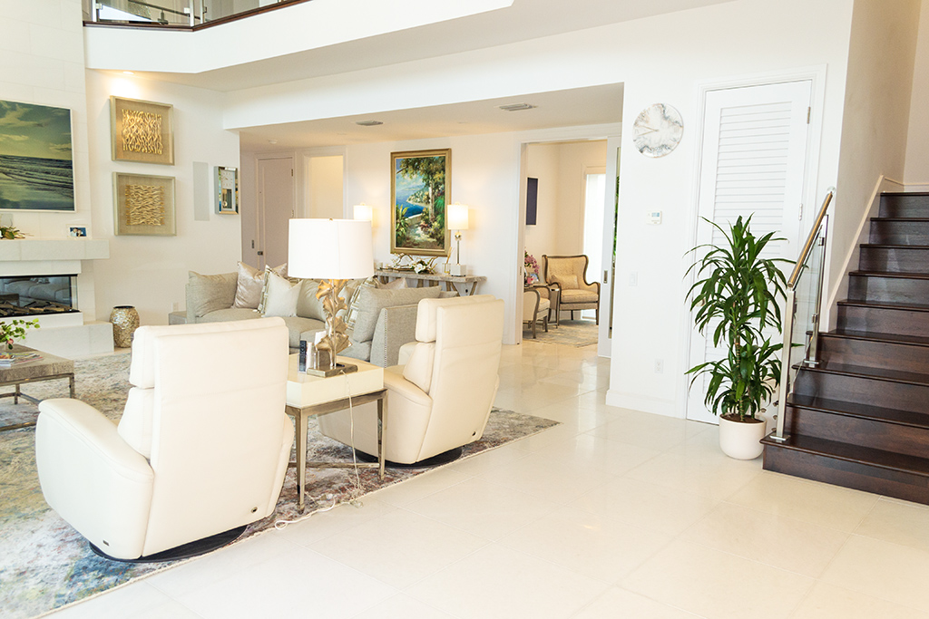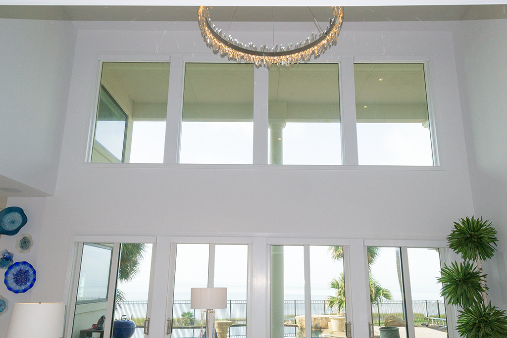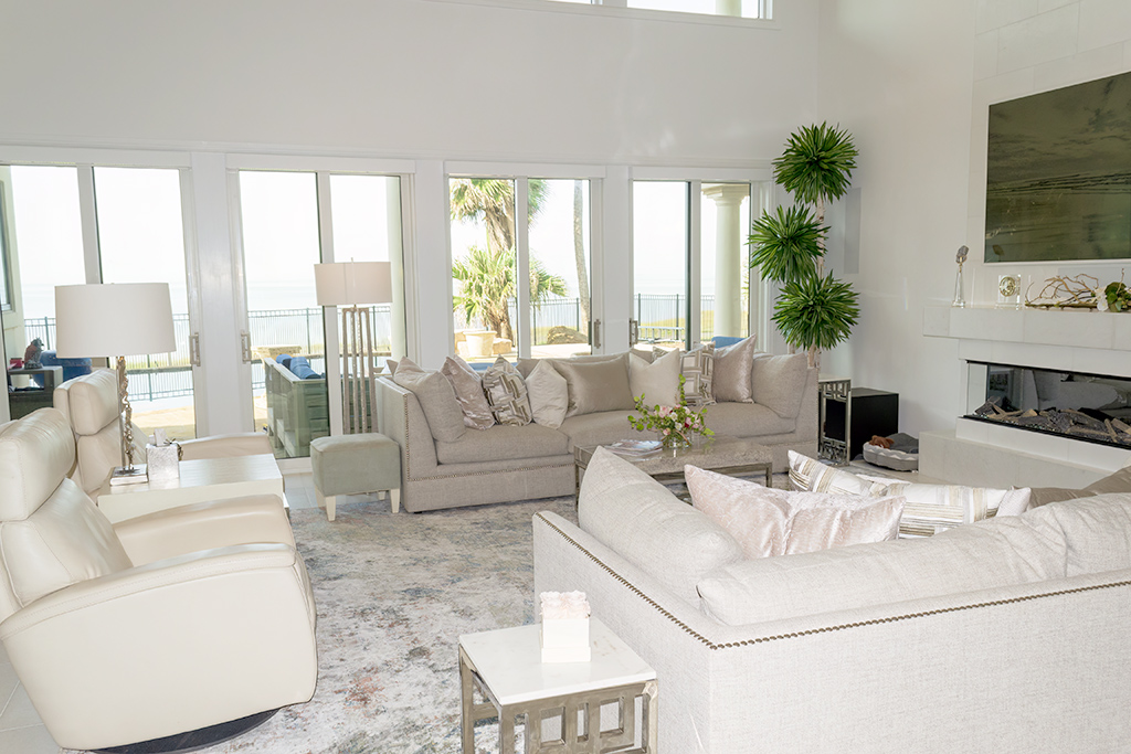 White and bright, the house is filled with light from multiple windows and sliding glass doors.