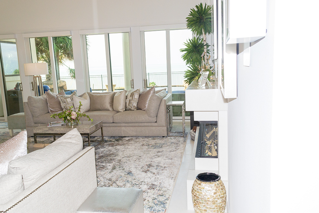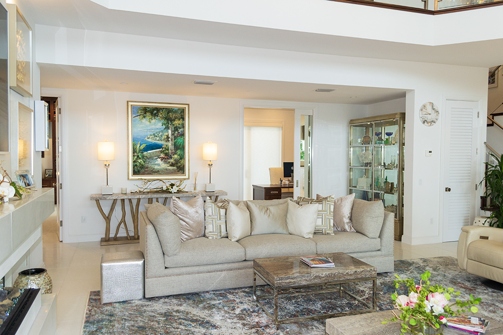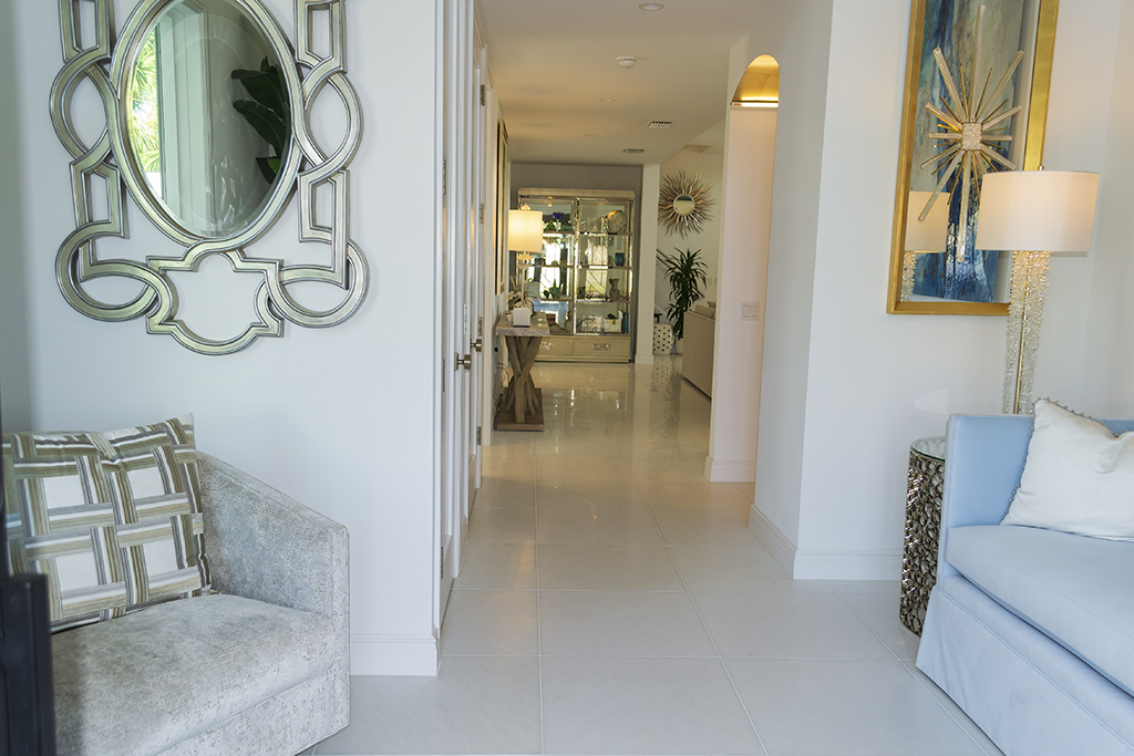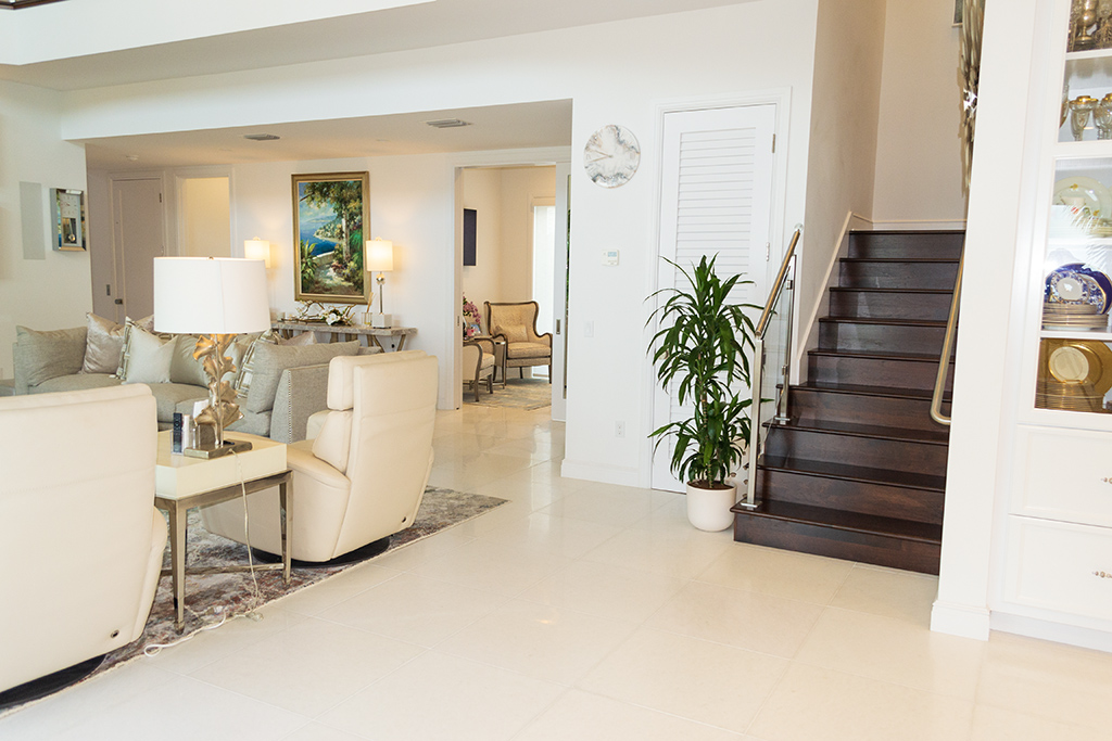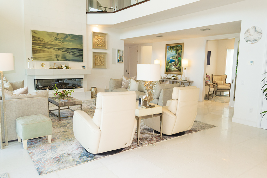 White and bright, the house is filled with light from multiple windows and sliding glass doors.