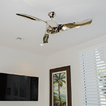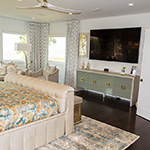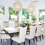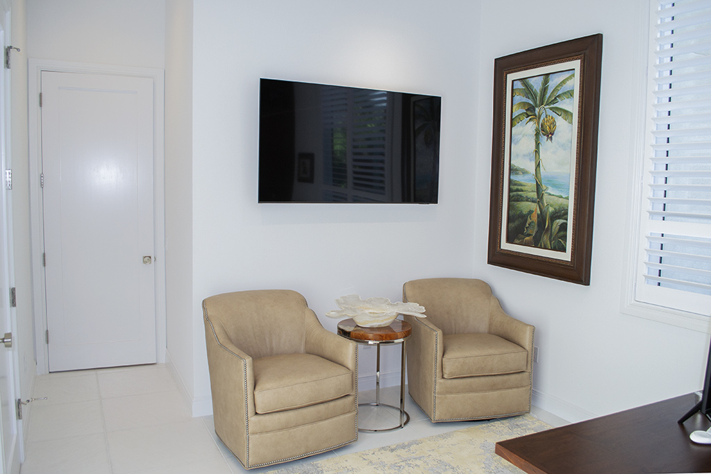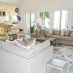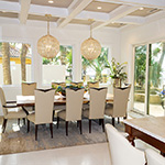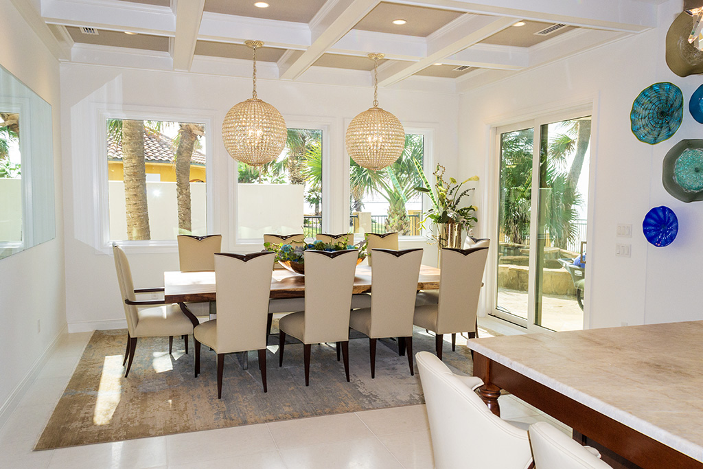 The dining room is an entertainer’s paradise as it is adjacent to the Chef’s kitchen. It includes two crystal chandeliers with a coved ceiling and seats ten comfortably. It also has a water view from the sliding glass doors.