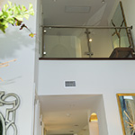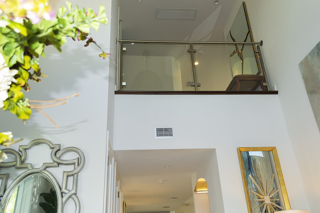 The upstairs rooms feature the master bedroom, 2 guest bedrooms, a fitness room and a laundry room, along with 4 bathrooms and custom hardwood flooring as do the stairs with glass and stainless railings. Trinity designed stainless railings with glass.