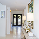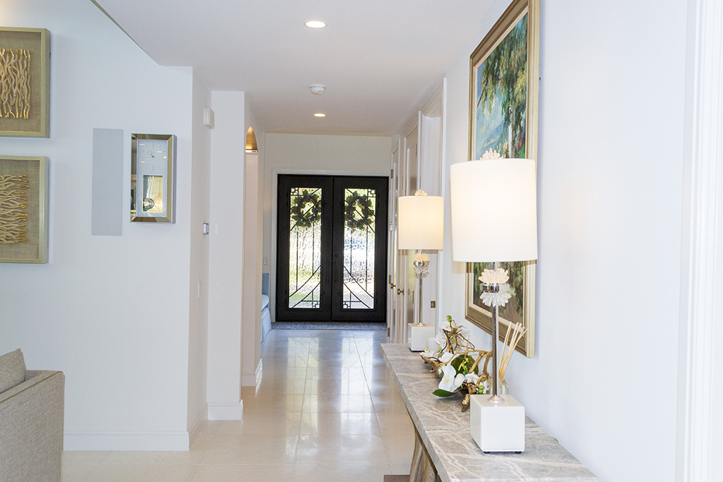 Enter the beautiful, custom exterior doors to find the spacious foyer and a floor to ceiling custom cabinet that is filled with art andprecious objets d’art. The second story elevator is in the foyer; hidden behind a wood door.