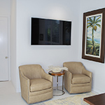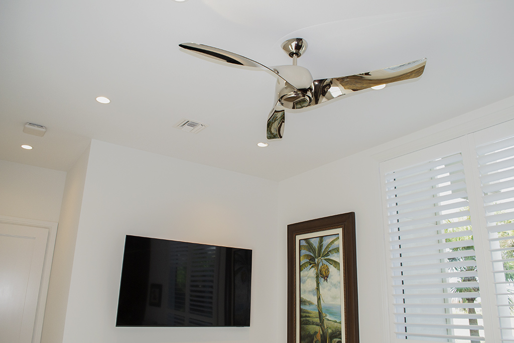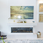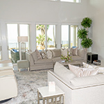 This living room features a soaring ceiling with huge, double-paned, custom windows and 4 sets of sliding glass doors that overlook the pool and the Bay. The electric fireplace allows for cozy evenings. The living room includes a wine bar to store the homeowner’s favorite vintages and a wine refrigerator. The floor tiles are imported from Italy and are installed in the entire home.