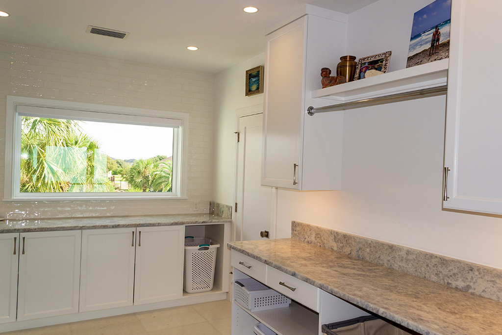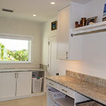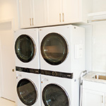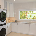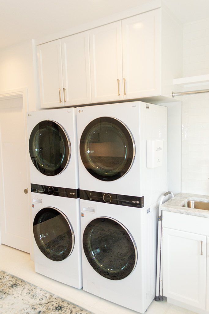 The large laundry room has double washers and dryers, lots of overhead storage cabinets and under cabinet storage. The sink cabinet and countertops are quartz. The laundry room has recessed lighting and a solid wood barn door.