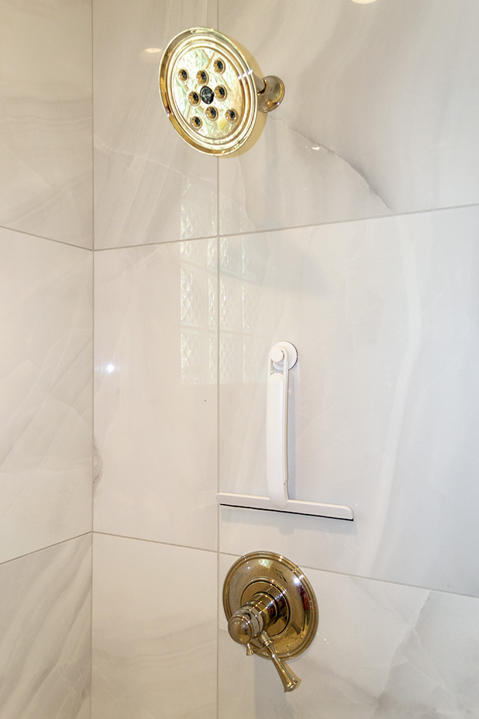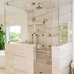 huge glass rain shower with a separate hand shower, a separate oval tub for reclining in the bath, and a chandelier, along with